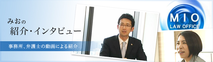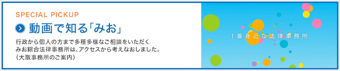 「弁護士法人みお」のこと、身近な法律問題のことについて、もっと皆様に知っていただくための、さまざまな動画をご紹介します。当事務所所属の弁護士のインタビュー、弁護士による法律問題の解説のほか、大阪事務所・京都事務所の詳しいご案内動画をご覧ください。