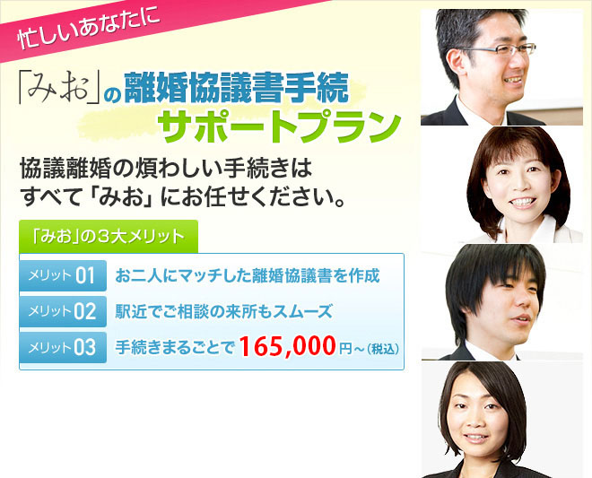 お二人の話し合いの結果、離婚することに決まったら、話し合いで決まった「離婚の条件」を書面(離婚協議書)にしておくことが大切です。財産分与のほか、養育費や慰謝料の具体的な金額や支払い方法、子どもの親権や面会交流の方法といった重要な事柄について、離婚協議書にきちんと記載しておけば、トラブルを未然に防ぐことができます。とくにお金の問題については、離婚協議書を公正証書で作成しておくことで、支払いが滞った場合、強制的に回収する手続きを取ることができて安心です。離婚協議書の作成は、正しい知識とたしかな経験を持つ「みお」の弁護士・行政書士にお任せください。