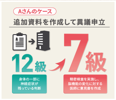 弁護士と保険会社で2倍以上の差に。 - 弁護士は、Aさんの治療を担当した医師に協力を依頼し、脳の機能についての精密検査を実施してもらうと同時に、検査結果についての詳細な意見書を作成してもらいました。さらに、交通事故前後のAさんの性格・行動の変化、それらを具体的に表すエピソードなどをご家族からお伺いし、「日常生活報告」としてまとめました。 それらの追加資料を揃えて、自賠責保険に対する異議申立を行ったところ、Aさんには「高次脳機能障害」という重い脳の障害があることが認められました。その結果、後遺障害等級は当初の12級13号から5段階も上昇し、7級の認定を受けました。