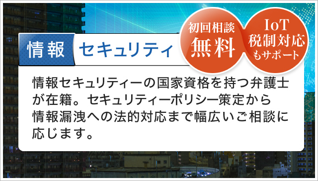IT関連企業の方へ 情報漏洩などシステム開発をめぐる法的紛争や、様々な法規制に対応。 詳しくはこちら 一般企業の方へ 個人情報の保護対策構築から、万一の場合の法的対応までフルサポート。 詳しくはこちら IoT税制対応 IoT導入事業計画申請書の確認資格を持つ弁護士が在籍しています。 詳しくはこちら