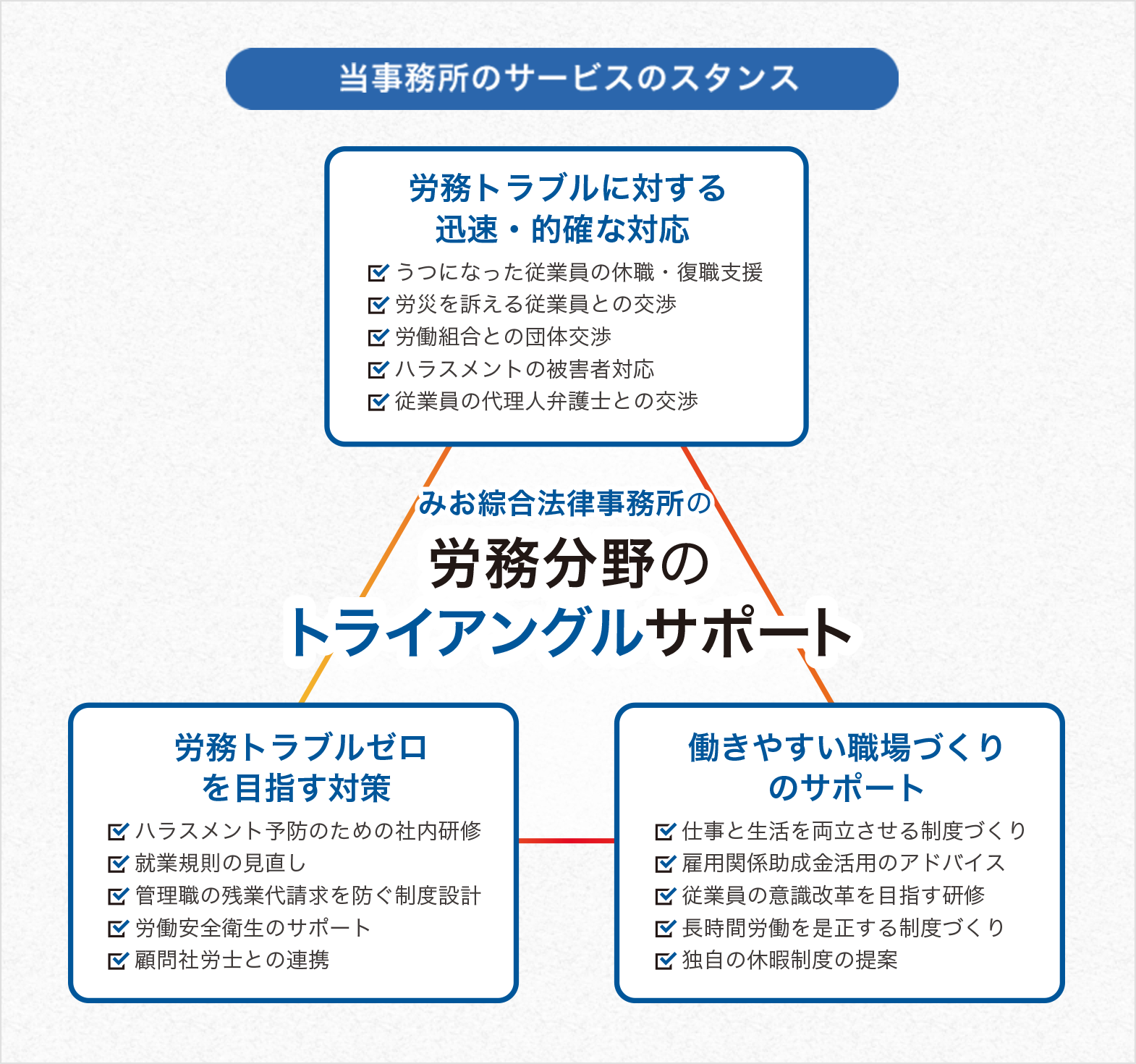 当事務所には、これまで、労働者側、使用者側の双方の立場から、様々な労務トラブルを解決してきた実績があります。だからこそ、双方の立場や考え方をきちんと理解し、労務トラブルに対してどのような初期対応を行うべきかについて、ノウハウを持っています。