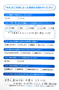 ご相談者アンケート 更新日 2024.12.10 1相談の予約はスムーズでしたか? はい 2相談予約・お問い合わせの電話、メールの対応はいかがでしたでしょうか? 5 毎週のラジオのおしゃべりそのままの親切な対 応で、満足しました。 3「みお」の弁護士に会われた時の第一印象は? 親しみやすい 4解決方法の説明は、わかりやすかったですか? 5 とてもわかりやすい 5弁護士費用についての説明はありましたか? はい 6ご相談の結果はいかがでしたか? 依頼した 7その他お気づきの点がありましたら、お知らせください。 本当に親しみやすい弁護士さんでした。お世話になりますが、 よろしくお願いいたします。 < 前のアンケート 一覧へ 次のアンケート >