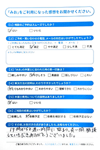 ご相談者アンケート 更新日 2024.12.10 1相談の予約はスムーズでしたか? はい 2相談予約・お問い合わせの電話、メールの対応はいかがでしたでしょうか? 4 満足 3「みお」の弁護士に会われた時の第一印象は? やさしそう 4解決方法の説明は、わかりやすかったですか? 5 とてもわかりやすい 5弁護士費用についての説明はありましたか? はい 6ご相談の結果はいかがでしたか? 依頼予定 7その他お気づきの点がありましたら、お知らせください。 19時と遅い時間からの相談でしたが、長い時間相談に乗っていただきありがとうございました。 < 前のアンケート 一覧へ 次のアンケート >