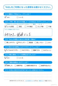 ご相談者アンケート 更新日 2017.09.09 1相談の予約はスムーズでしたか? はい 2相談予約・お問い合わせの電話、メールの対応はいかがでしたでしょうか? 5 とても満足 わかりやすい説明でした。 3「みお」の弁護士に会われた時の第一印象は? やさしそう 4解決方法の説明は、わかりやすかったですか? 5 とてもわかりやすい 5弁護士費用についての説明はありましたか? はい 6ご相談の結果はいかがでしたか? 依頼した 7その他お気づきの点がありましたら、お知らせください。 < 前のアンケート 一覧へ 次のアンケート >