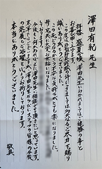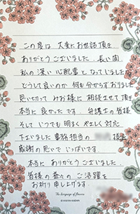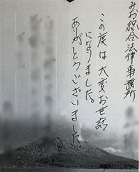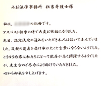 ご依頼者からのお手紙 弁護士・スタッフの親身になった対応に、感謝のお手紙を多数頂戴しています。 ここでその一部を紹介させていただきます。 更新日 2023.12.16 B型肝炎給付金請求 澤田有紀先生 この度はB型肝炎訴訟の件につきまして多大なるご尽力を賜り 誠にあり… 詳しく見る 更新日 2023.12.16 アスベスト 私は先日ご依頼いたしました〇〇〇〇の叔母です。 〇〇〇〇の父親のアスベスト被害の… 詳しく見る 更新日 2023.12.16 一般分野 入金確認致しました。通帳に実際に入るまでは実感が湧かず、半信半疑でした。でも今、… 詳しく見る 更新日 2023.12.16 B型肝炎給付金請求 B型肝炎訴訟では大変お世話になりました。 先日は、母子手帳などのご返却と、給付金… 詳しく見る 更新日 2023.12.16 一般分野 みお綜合法律事務所御中 この度は大変お世話になりました。 ありがとうございました… 詳しく見る 更新日 2023.12.16 B型肝炎給付金請求 この度は 大変なお世話を頂き、ありがとうございました。 B型肝炎のことは長い間、… 詳しく見る 更新日 2023.02.21 B型肝炎給付金請求 澤田有紀先生 事務局様 いつも大変お世話になっております。 先日、指定口座への給… 詳しく見る 更新日 2023.02.21 B型肝炎給付金請求 澤田有紀様 本日、指定口座に入金されておりますことを確認いたしました。 手続きを… 詳しく見る 更新日 2023.02.21 一般分野 吉山晋市先生 原口柊太先生 この度は本当に有難うございました。今後ともよろしくお… 詳しく見る 更新日 2023.02.21 B型肝炎給付金請求 拝啓 新涼の候 益々ご清栄のこととお慶び申し上げます。 この度のB型肝炎訴訟にお… 詳しく見る 4 / 14« 先頭«...23456...10...»最後 »